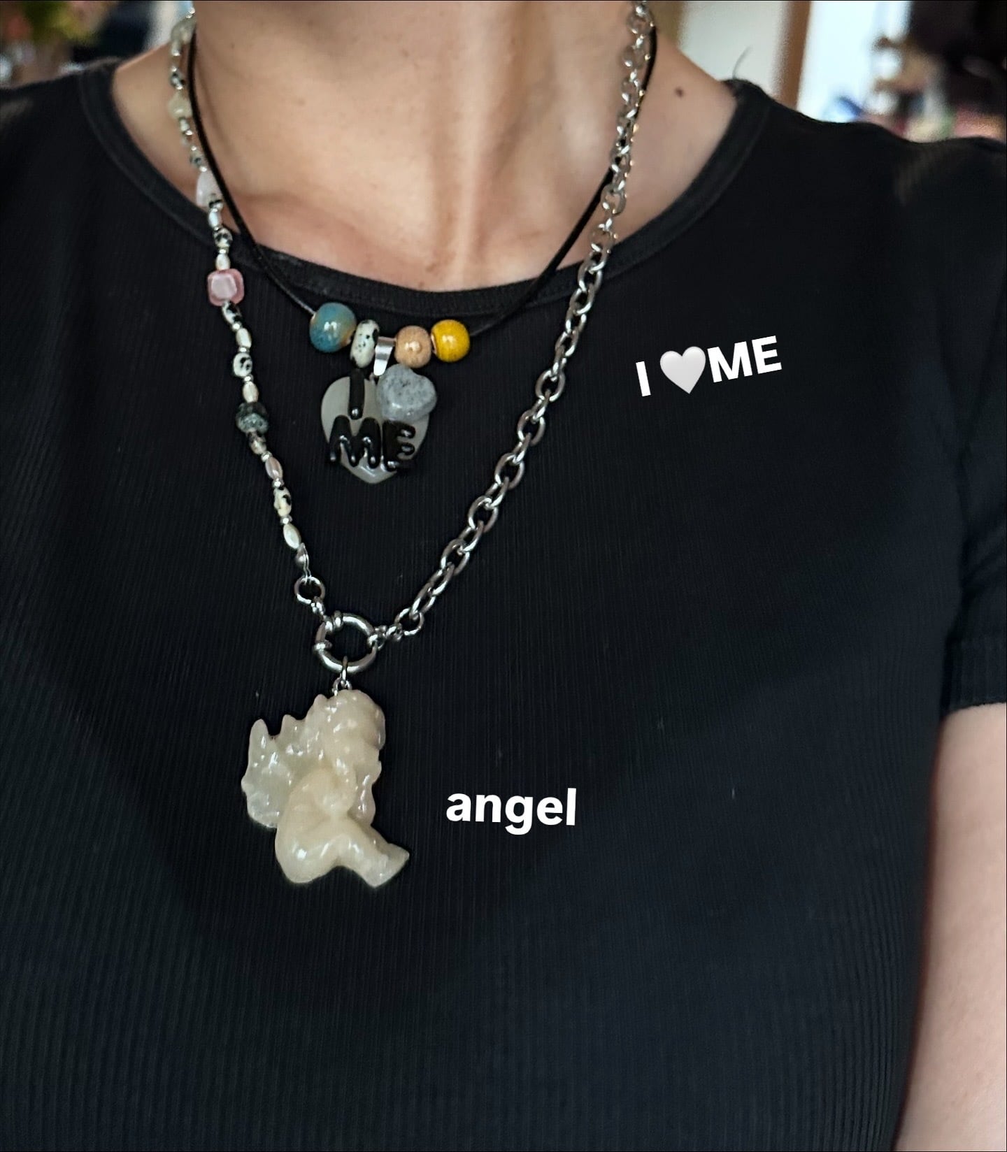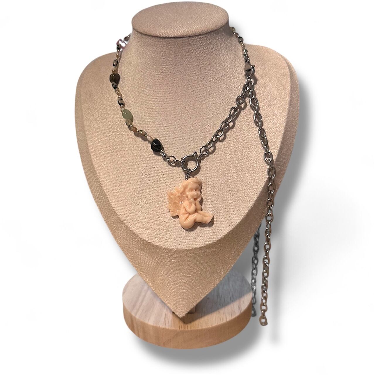 clayで作ったangelのパーツがポイント! 天然石&ビーズとステンレス製チェーンを使ったネックレスは好きな長さで使っていただけます。 最長で約50cm。 着用画像→乳白色チャーム着用。 トルソー→ピンク着用。