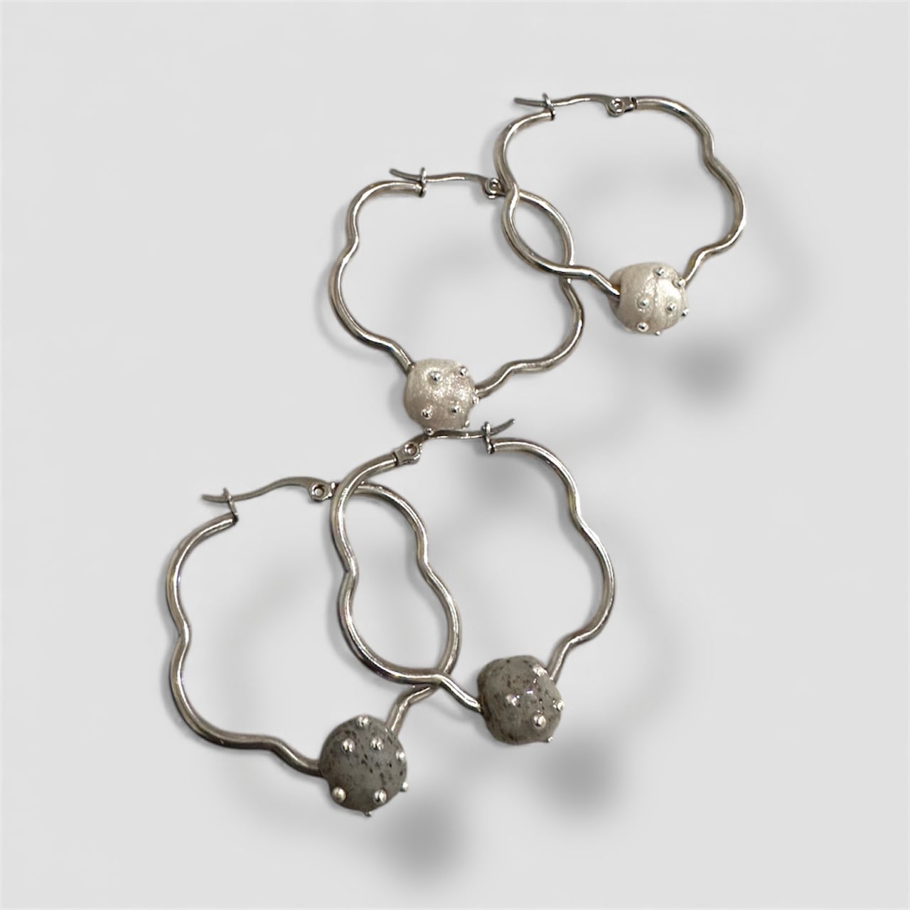 大人気のフラワーフープの新デザイン。 ベーシックなカラーにスタッズを乗せました。 どんな服装にもハマる、使いやすいピアスです。 ピアスはステンレス製。 着画は別カラーですが、大きさは同じです。