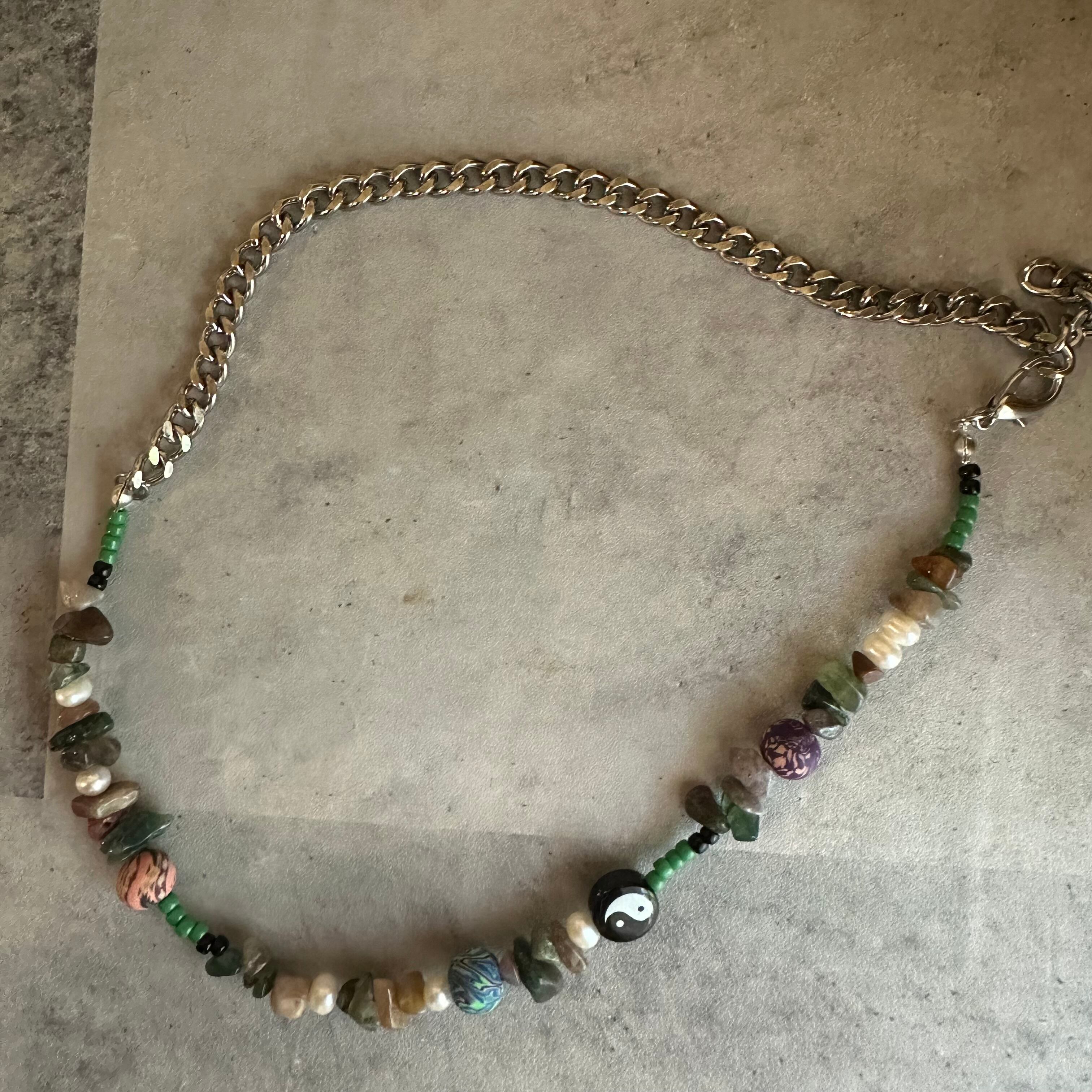 くすみカラーの天然石と、ビーズ、ポリマークレイパーツにインヤンパーツ…もりだくさん組み合わせました。